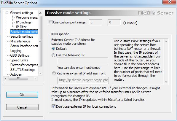 In the event that the IP address your server uses in responding to requests for passive connections is not routable via the Internet, you’ll need to enter your public IP address in the Passive IP field.