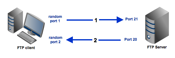 By contrast, in the passive mode, the second arrow is pointing to the server. Here, the server specifies which server-side port the client should connect to and the client initiates the connection.